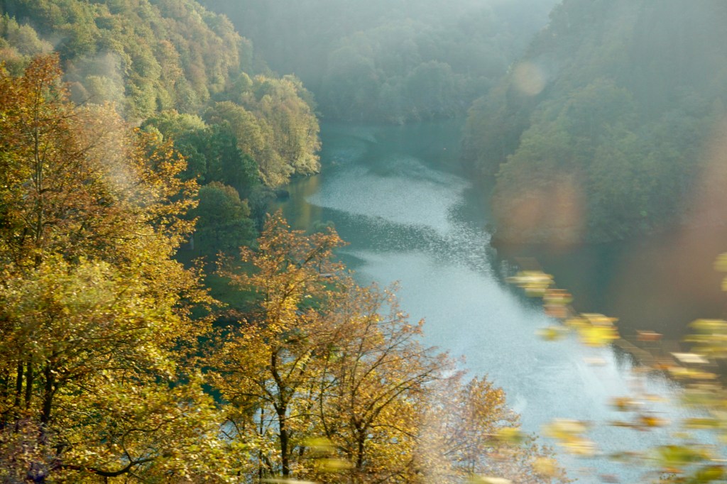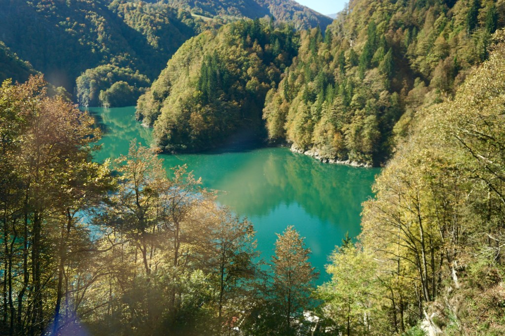 Il susseguirsi di curve e gallerie ci porta verso le montagne, dove il foliage, caratteristico di questo periodo, si fa più intenso. Complice anche il bel tempo che ha accompagnato l’intera giornata, siamo riusciti a godere di scorci mozzafiato e ad ammirare il contrasto del sole ancora alto che filtrava attraverso la fitta boscaglia ingiallita.